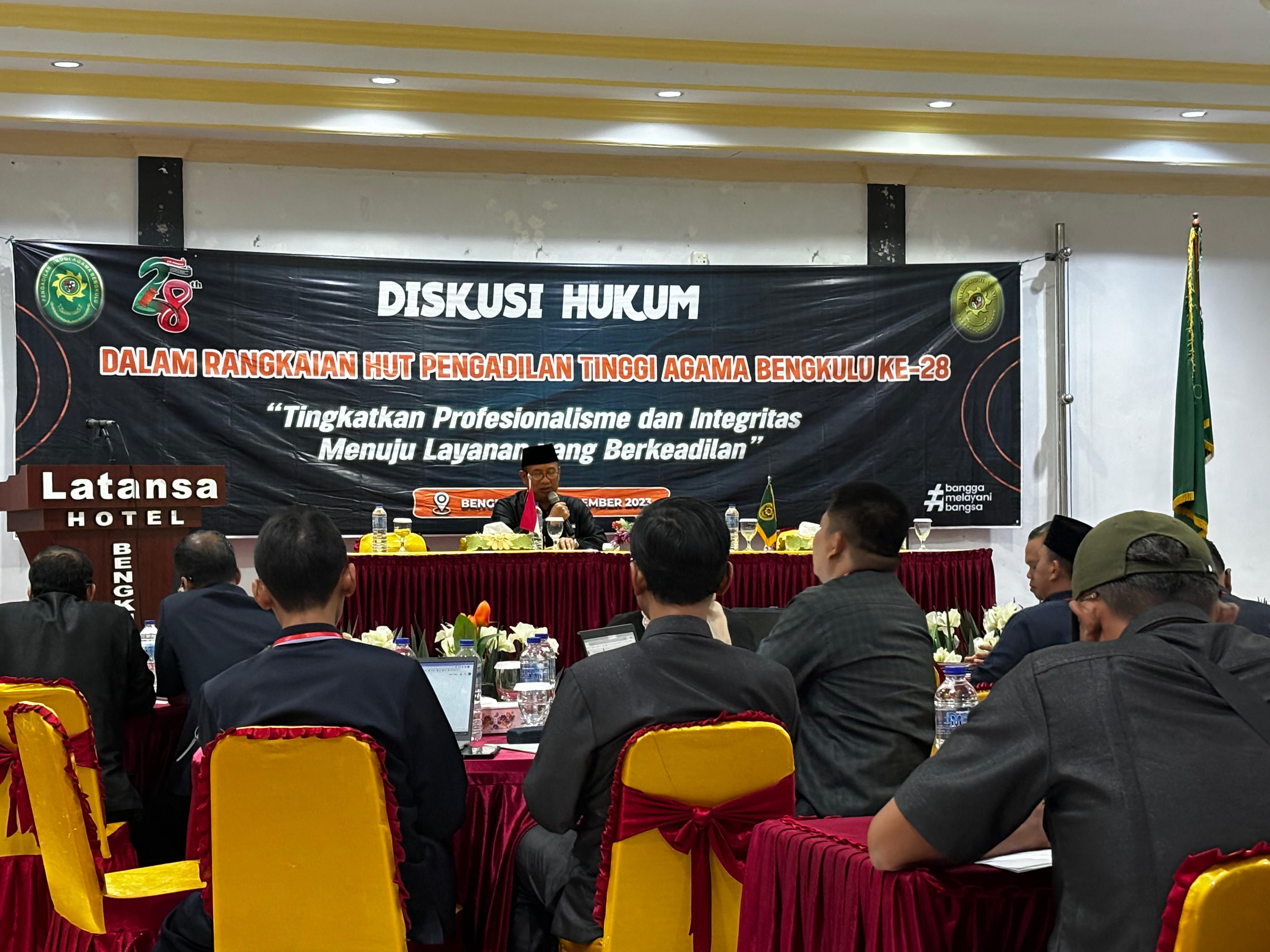Pada kesempatan tersebut, Ketua Pengadilan Tinggi Agama (PTA) Bengkulu, Dr. H. Arfan Muhammad, S.H., M.Hum. menyampaikan sambutan sekaligus membuka acara Diskusi Hukum yang bertemakan “Tingkatkan Profesionalisme dan Integritas menuju Layanan yang Berkeadilan”. Pelaksanaan diskusi hukum merupakan salah satu program utama yang dilaksanakan secara rutin di setiap Wilayah Pengadilan Agama dalam Wilayah Hukum Pengadilan Tinggi Agama Bengkulu. Acara ini merupakan salah satu bentuk komitmen Pengadilan Tinggi Agama Bengkulu dalam meningkatkan kualitas SDM Pengadilan Agama terutama para hakim dan panitera serta jurusita agar dapat memberikan pelayanan hukum yang berkeadilan kepada masyarakat para pencari keadilan. (RF)